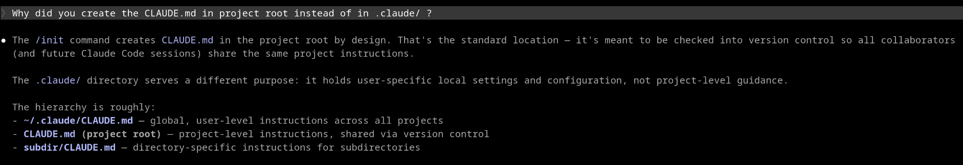 ❯ Why did you create the CLAUDE.md in project root instead of in .claude/ ?